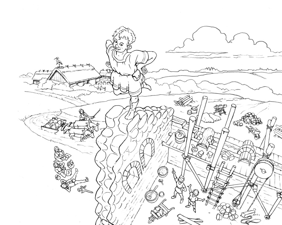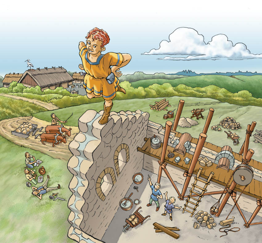 viser de tre drenge, der leger pŒ byggepladsen til Fjenneslev kirke...