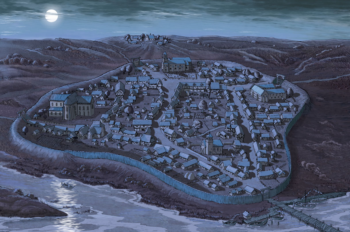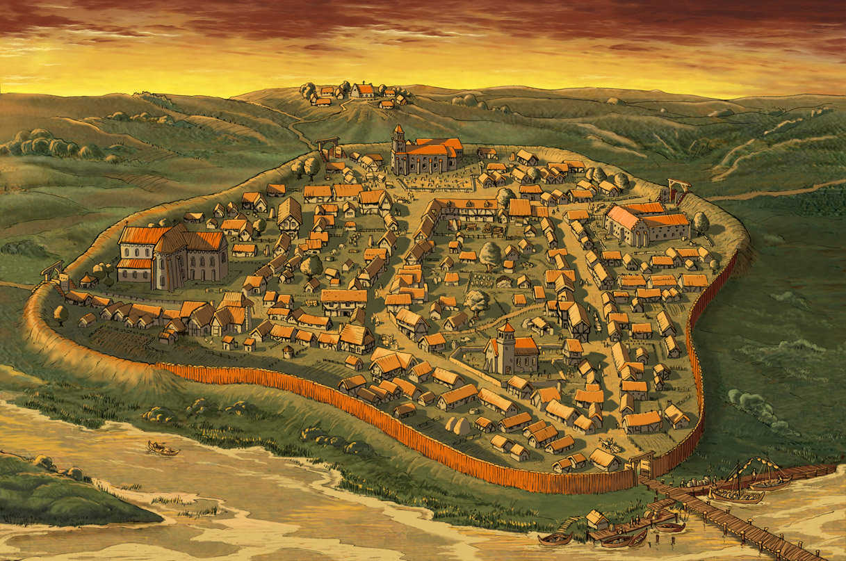 I got an assignment to draw an arial view of Randers as it might have looked around the year 1300...